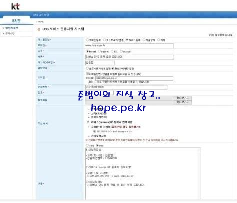 3. 글쓰기 화면에서, 다음 작성 예시 화면을 참고하여 리버스 DNS 등록 요청 글 을 작성 합니다.