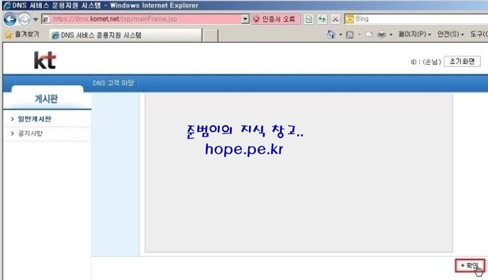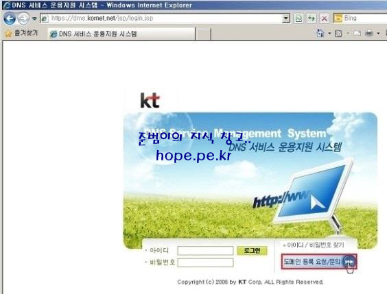 1. KT DNS 서비스 운용지원 시스템 (http://dns.kornet.net/jsp/login.jsp) 사이트 접속 후 도메인 등록 요청/문의 를 클릭 합니다.