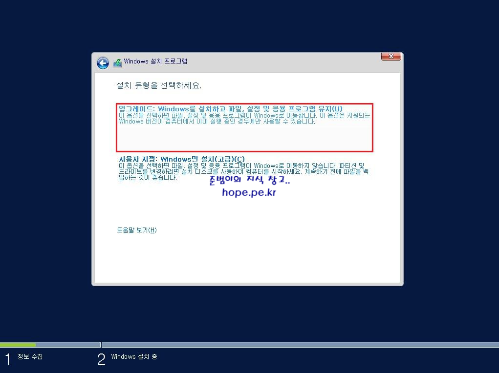 설치 유형을 선택하세요. 화면에서, 업그레이드: Windows를 설치하고 파일, 설정 및 응용 프로그램 유지 를 클릭 합니다.