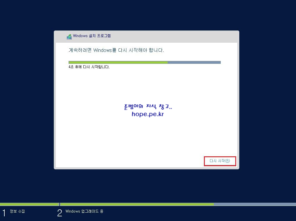 설치가 다시 시작되는 중 화면에서, 잠시 기다리면 Windows 업데이트 를 확인 및 설치 후 다음 화면으로 넘어갑니다.