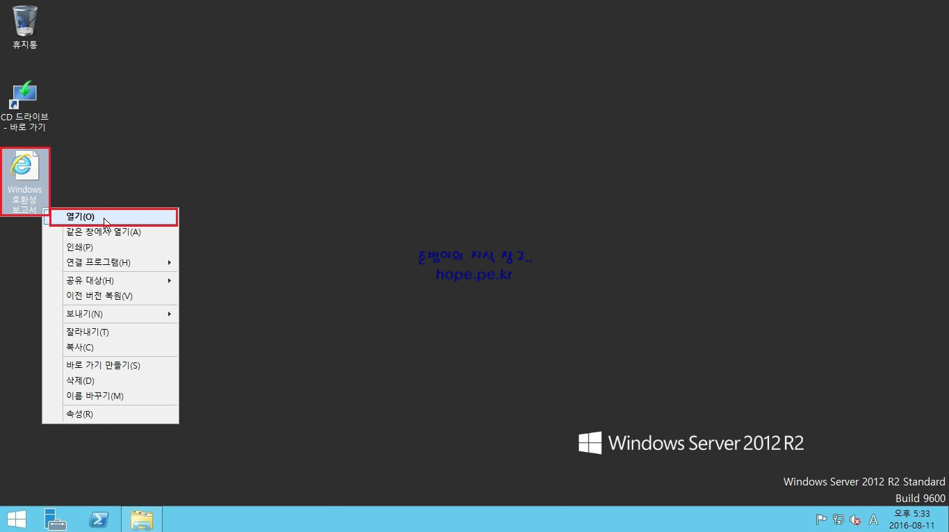 설치 과정중에 언급 되였듯이 바탕 화면에 Windows 호환성 보고서 파일이 생성 되였습니다. 우클릭 후 열기 를 클릭 합니다.