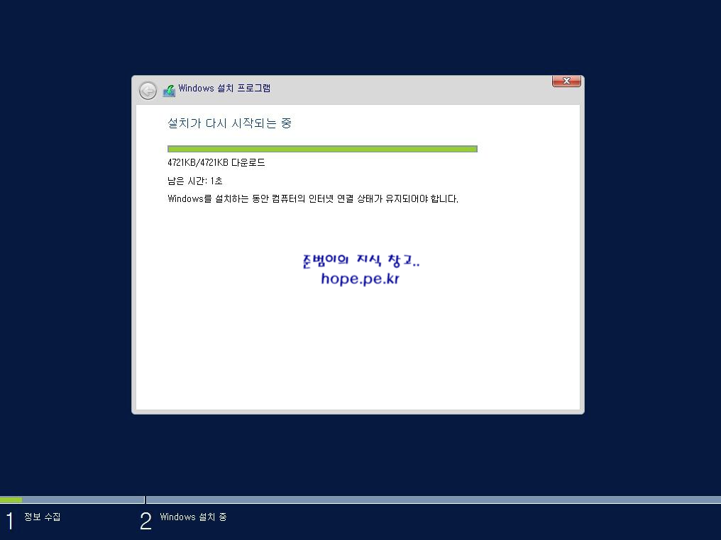 설치가 다시 시작되는 중 화면에서, 잠시 기다리면 Windows 업데이트 를 확인 및 설치 후 다음 화면으로 넘어갑니다.