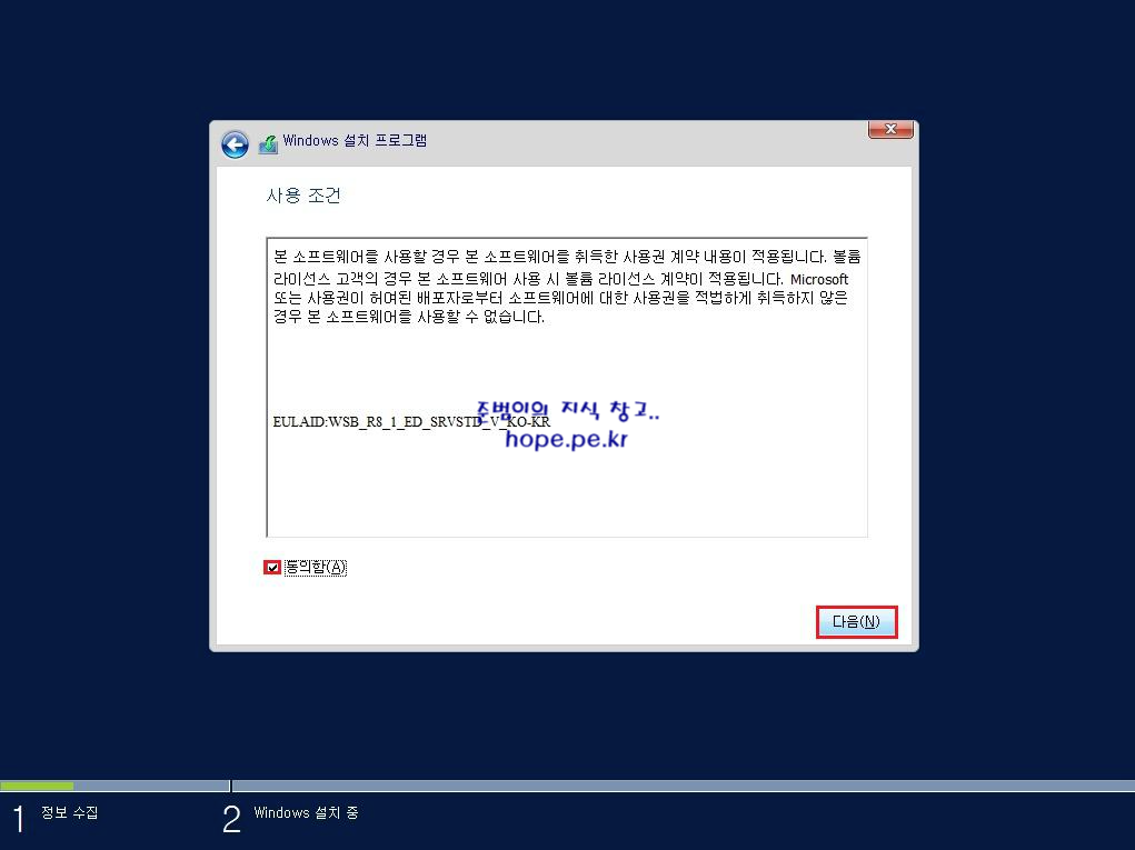 사용 조건 화면에서, 동의함 에 체크 후 다음 을 클릭 합니다.
