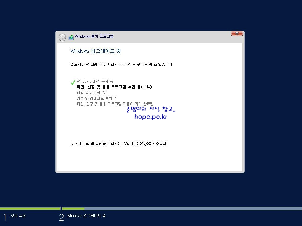 Windows 업그레이드 중 화면에서, 설치가 완료 될때까지 기다립니다.