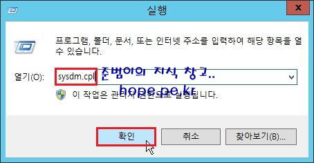 원격 연결 허용을 위해 '실행 창 (윈도우 키 + R 키)' 에서, 'sysdm.cpl' 입력 후 '확인' 을 클릭 합니다.