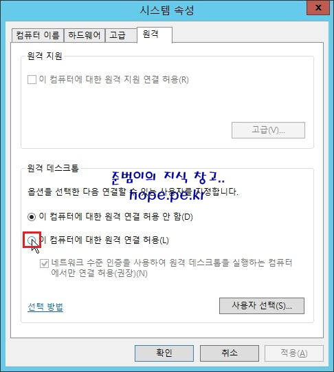 시스템 속성 창에서, '원격' 탭 으로 이동 후 '이 컴퓨터에 대한 원격 연결 허용' 을 선택 합니다.