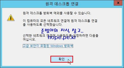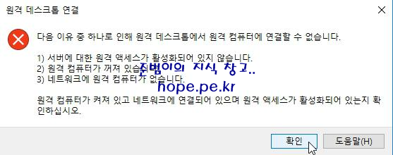 원격 데스크톱 연결 창에서, '확인' 을 클릭 합니다.
