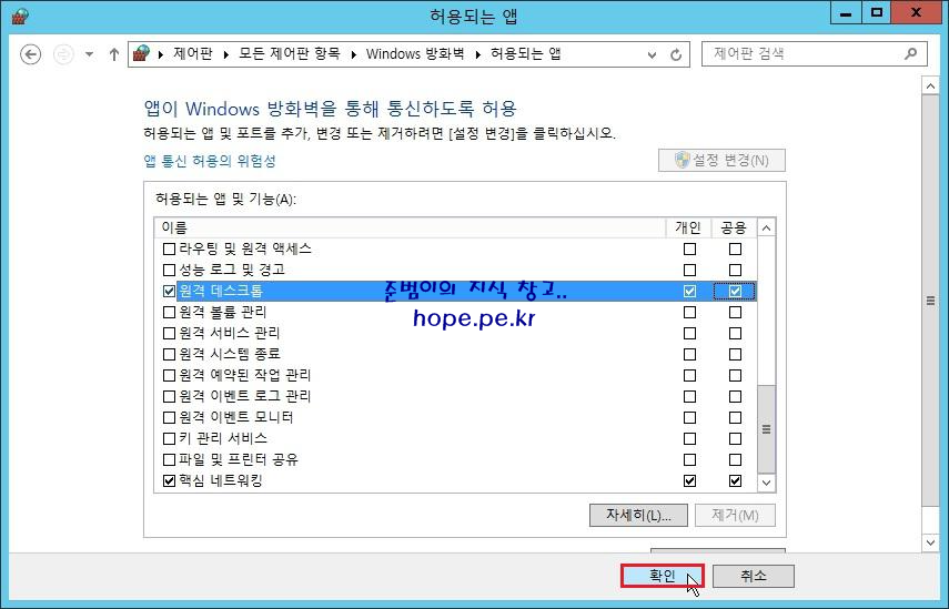 허용되는 앱 창에서, '원격 데스크톱' 의 '공용' 에 체크 합니다.