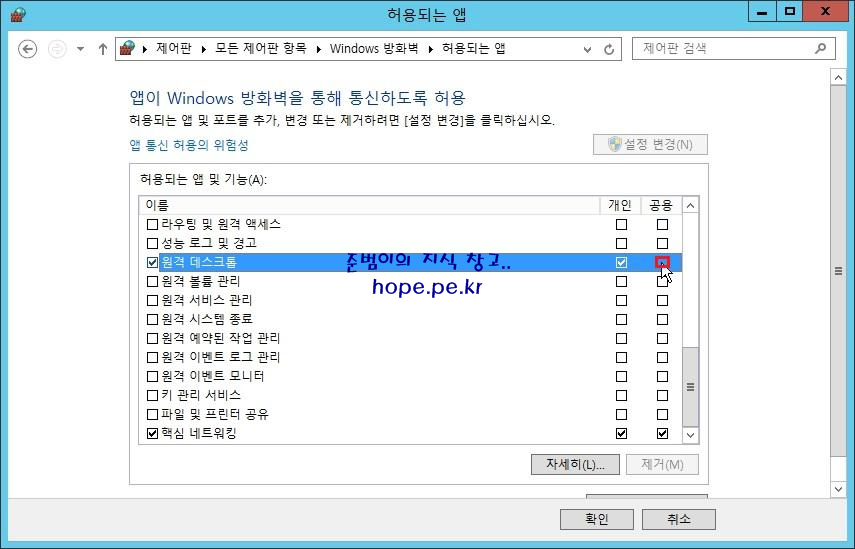 허용되는 앱 창에서, '원격 데스크톱' 의 '공용' 에 체크 합니다.