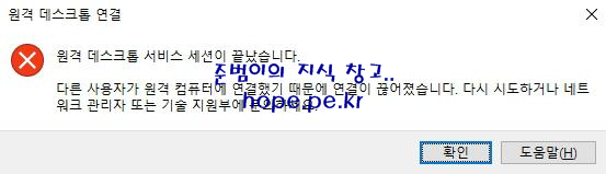 그럼 JBKIM-PC 의 원격 데스크톱 연결 창은 아래 스샷의 메세지와 함께 연결이 종료 됩니다.