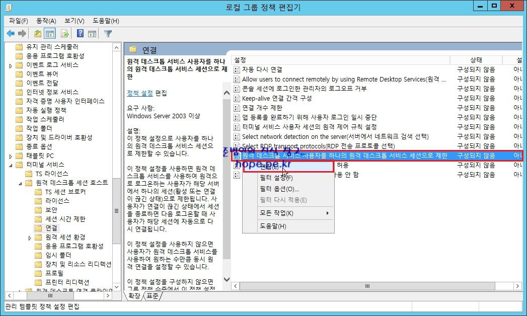 로컬 그룹 정책 편집기 창에서, '로컬 컴퓨터 정책 - 컴퓨터 구성 - 관리 템플릿 - Windows 구성 요소 - 터미널 서비스 - 원격 데스크톱 세션 호스트 - 연결 - 원격 데스크톱 서비스 사용자를 하나의 원격 데스크톱 서비스 세션으로 제한' 에서 우클릭 후 '편집' 을 클릭 합니다.
