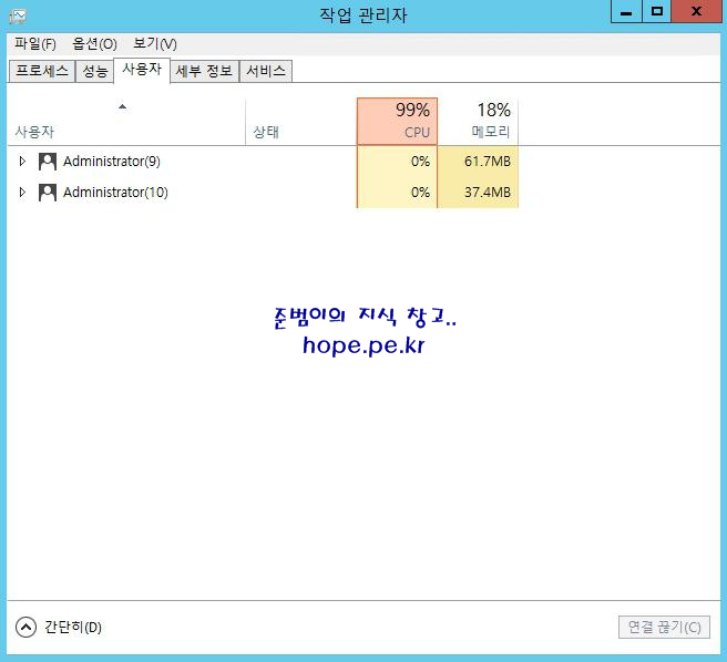 참고로 작업 관리자 창 실행 후 사용자 탭을 보면, 두세션이 연결 되여 있음을 확인할 수 있습니다.