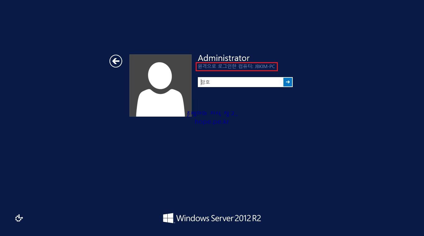 그리고 콘솔 에서 서버 관리자 A 가 다시 로그인을 시도 하면 아래 스샷과 같이 원격으로 로그인 한 컴퓨터 이름 JBKIM-PC 를 확인할 수 있습니다.