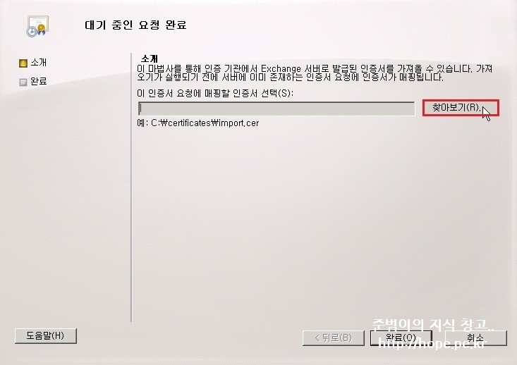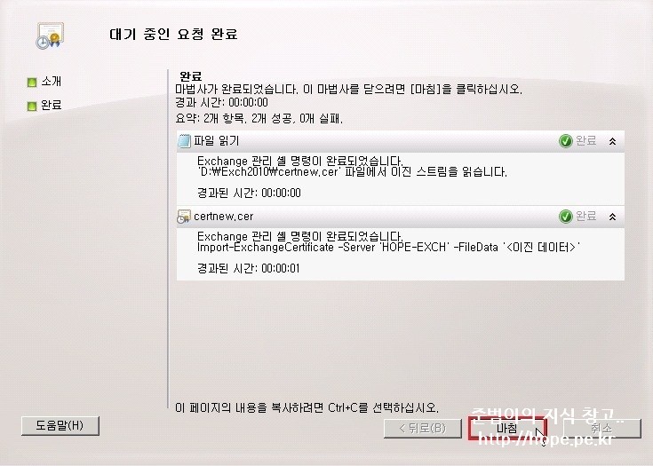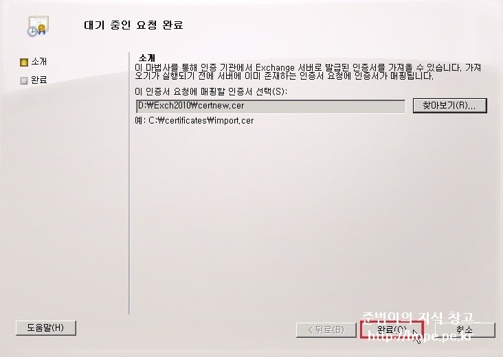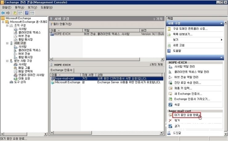 1. Exchange 관리 콘솔 창에서, 서버 구성 - 생성한 인증서 - 대기중인 요청 완료 를 클릭 합니다.