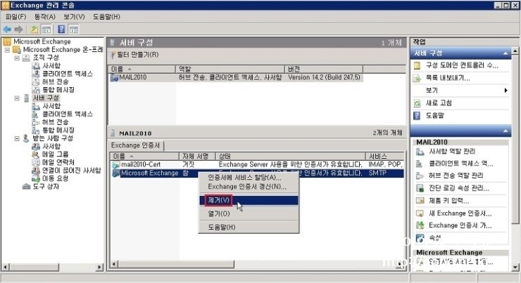 1. Exchange 관리 콘솔 창에서, 서버 구성 - 불필요한 기존 인증서 에서 우클릭 후 제거 를 클릭 합니다.
