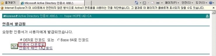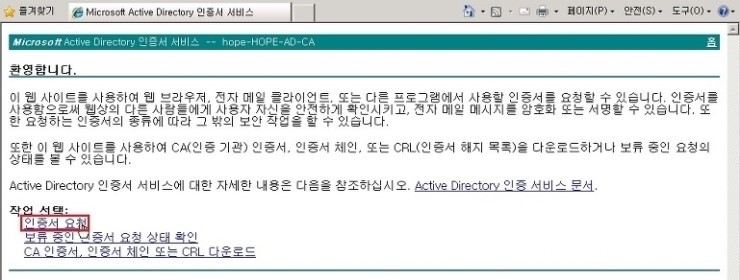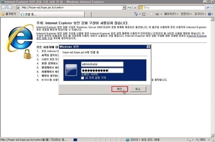 1. Internet Expolorer 창에서, 인증기관 certsrv 접속 후 관리자 계정 정보 입력 후 확인 을 클릭 합니다.