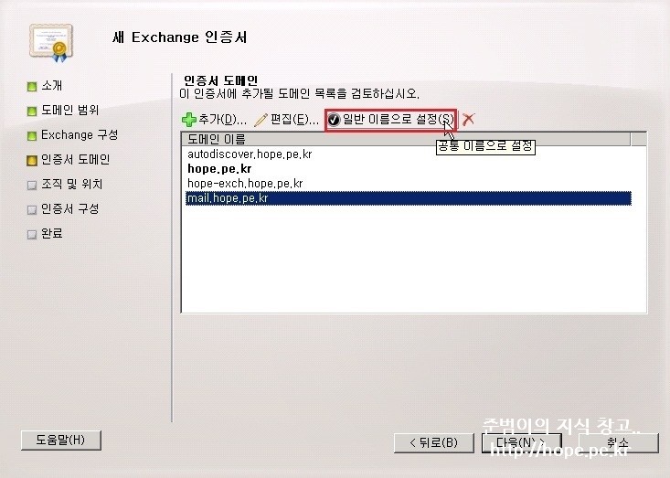 5. 인증서 도메인 화면에서, 일반 이름으로 설정할 도메인 선택 후 일반 이름으로 설정 을 클릭 합니다.
