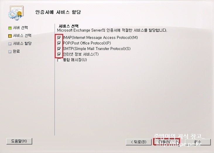 3. 서비스 선택 화면에서, 사용할 서비스 선택 후 다음 을 클릭 합니다.