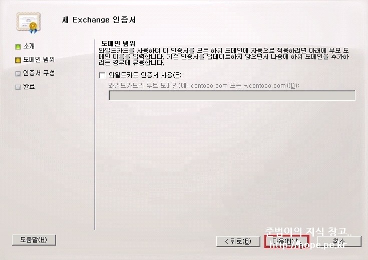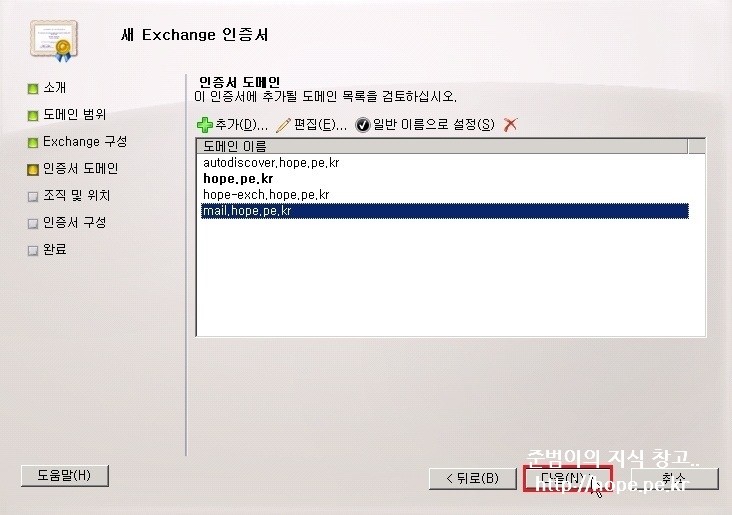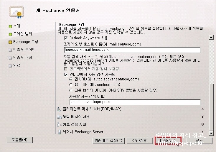 4. Exchange 구성 화면에서, 인증서에 사용할 주체 대체 이름 입력 후 다음 을 클릭 합니다.