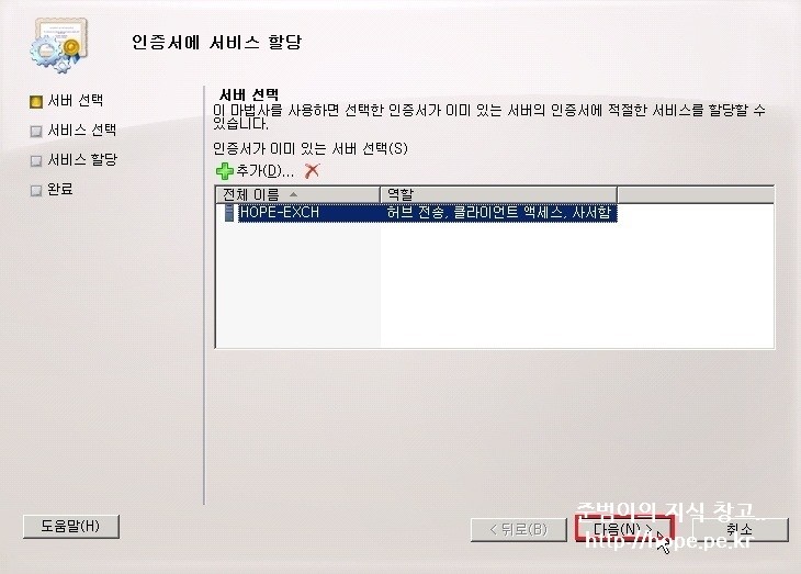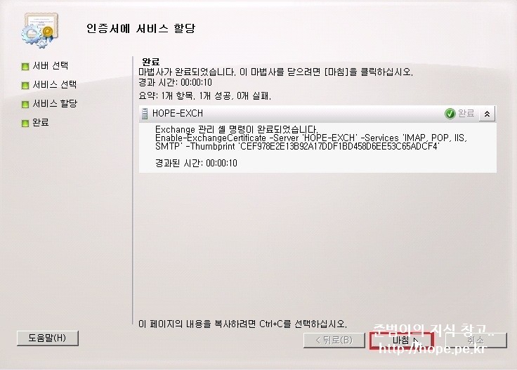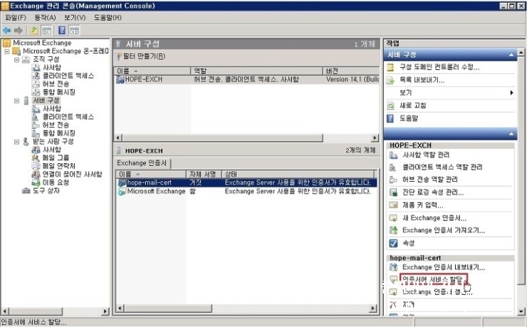1. Exchange 관리 콘솔 창에서, 서버 구성 - 생성한 인증서 - 인증서에 서비스 할당 을 클릭 합니다.