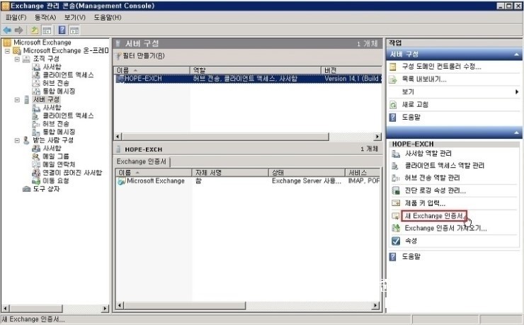 1. Exchange 관리 콘솔 창에서, 서버 구성 - 서버 - 새 Exchange 인증서 를 클릭 합니다.
