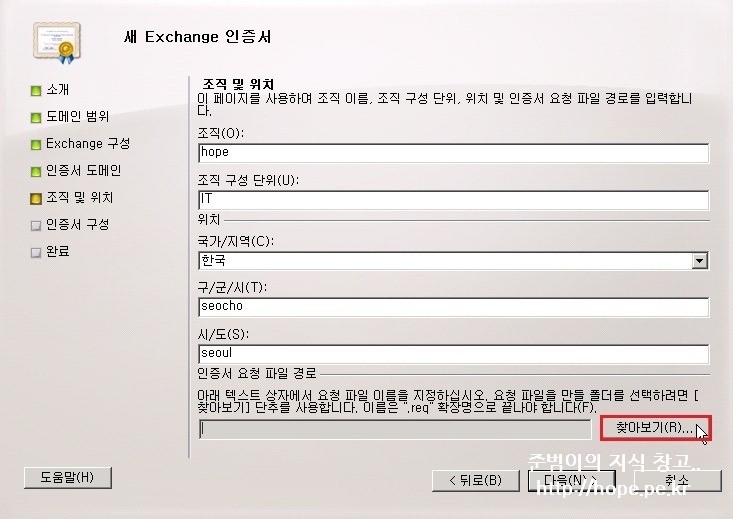 7. 조직 및 위치 화면에서, 조직 및 위치 정보 입력 후 찾아보기 을 클릭 합니다.