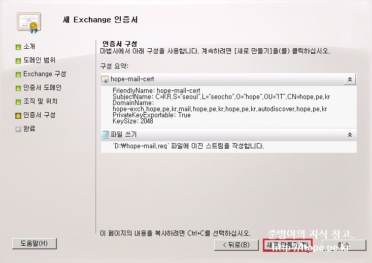 새 Exchange 인증서 만들기