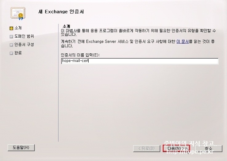2. 새 Exchange 인증서 창에서, 인증서의 이름 입력 후 다음 을 클릭 합니다.