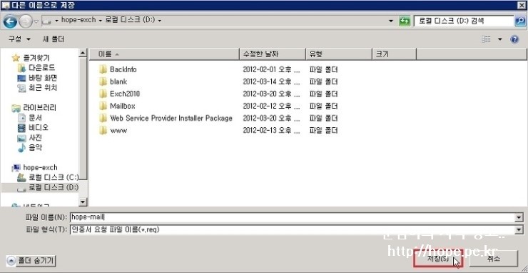 8. 다른 이름으로 저장 창에서, 인증서 요청 파일 경로 지정 후 저장 을 클릭 합니다.