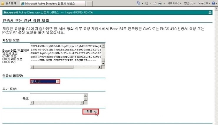 7. 인증서 탬플릿 을 웹서버 선택 후 제출 을 클릭 합니다.