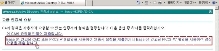 4. 고급 인증서 요청 화면에서, Base 64 인코딩 CMC 또는 PKCS #10 파일을 사용하여 인증서 요청을 제출하거나 Base 64 인코딩 PKCS #7 파일을 사용하여 갱신 요청을 제출 합니다. 을 클릭 합니다.