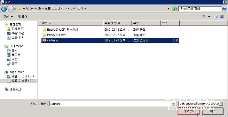 3. 19번 과정에서 저장한 인증서(cer) 파일 선택 후 열기 를 클릭 합니다.