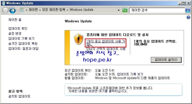 30. Windows Update 창에서, 1개의 중요 업데이트 사용 가능 을 클릭 합니다.