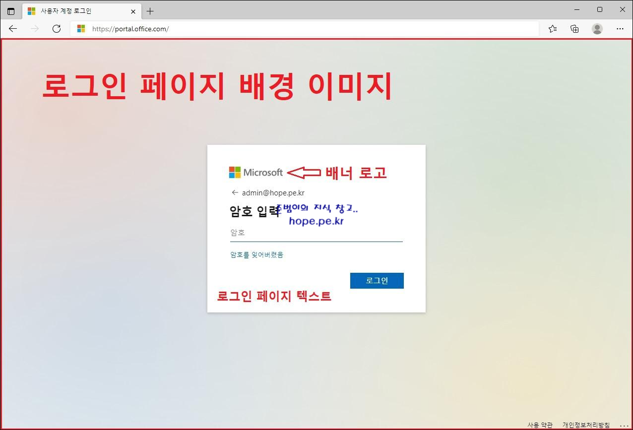 다시 office.com 사이트에 접속후 로그인을 시도해보면, 우와~ 배경 이미지, 배너 로고 그리고 텍스트가 잘 적용 되었습니다.