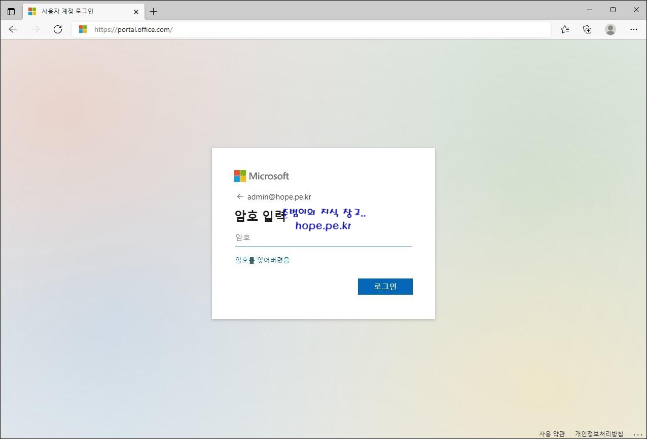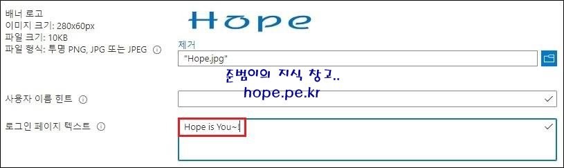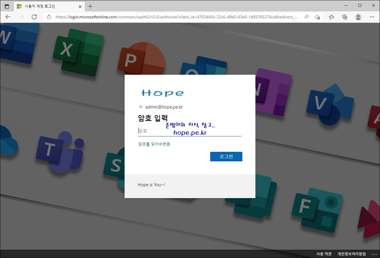 다시 office.com 사이트에 접속후 로그인을 시도해보면, 우와~ 배경 이미지, 배너 로고 그리고 텍스트가 잘 적용 되었습니다.