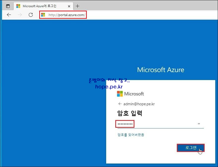 'portal.azure.com' 사이트에 접속후 관리자 계정으로 로그인을 진행합니다.
