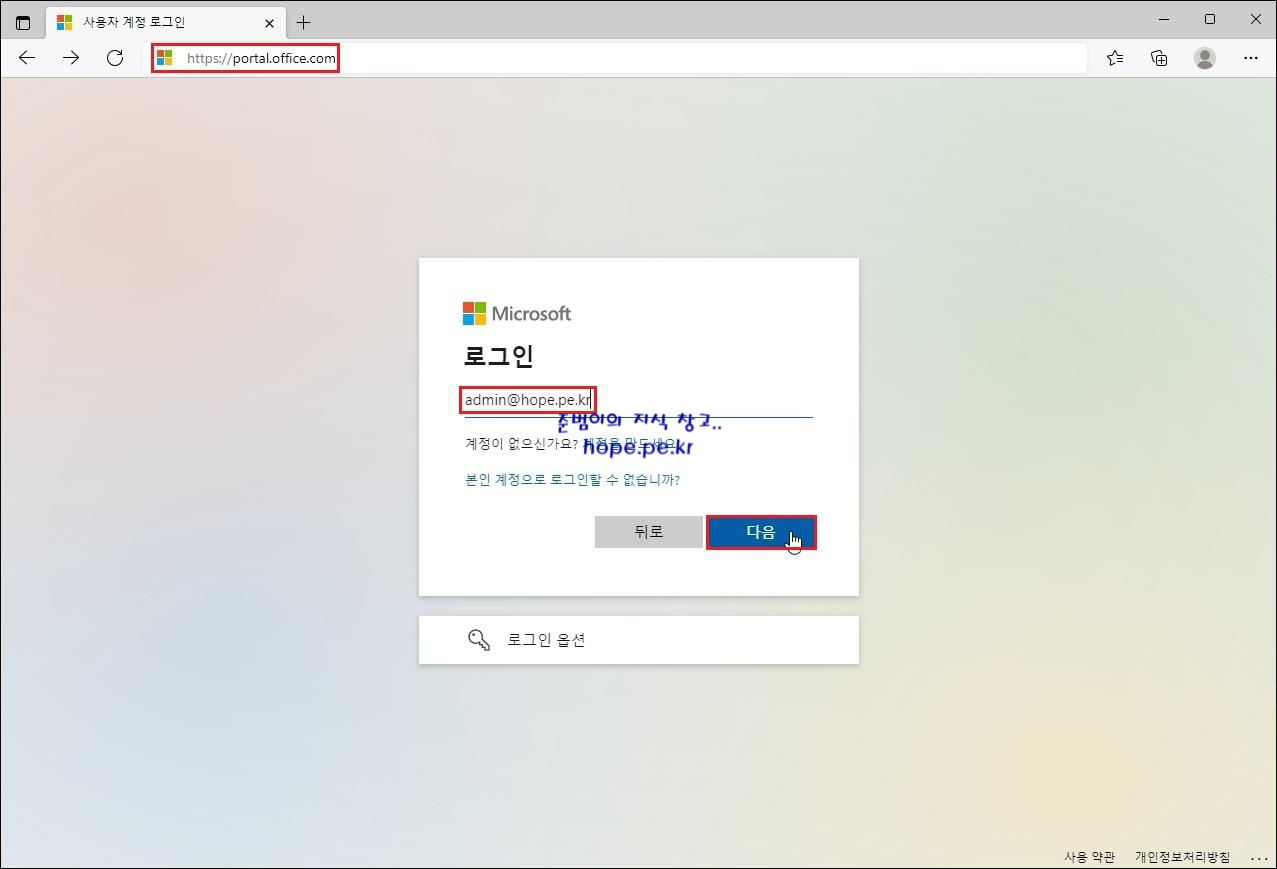 웹브라우저에서 'portal.office.com' 에 접속 합니다. '계정' 입력후 '다음' 을 클릭 하면