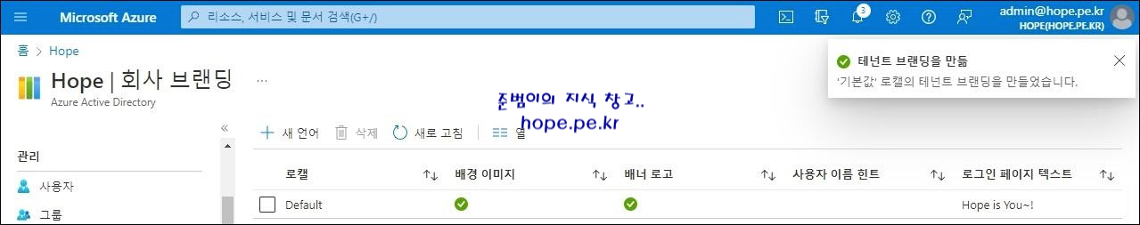 '테넌트 브랜딩을 만듦 - '기본값' 로캘의 테넌트 브랜딩을 만들었습니다.' 알림 메세지를 확인 합니다.