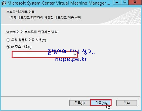 호스트 네트워크 이름 화면에서, 'IP 주소 사용' 선택 후 'IP 주소 입력' 후 '다음' 을 클릭 합니다.