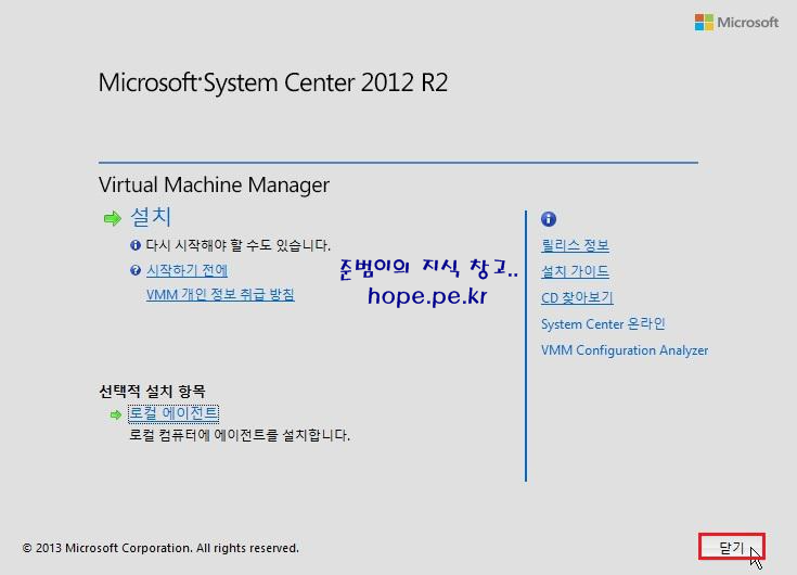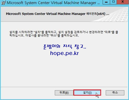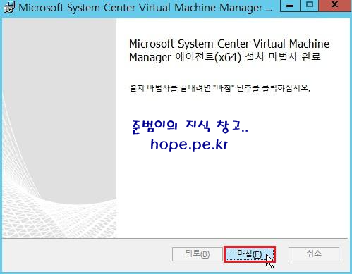 Microsoft System Center Virtual Machine Manager 에이전트 (x64) 설치 마법사 완료 화면에서, '마침' 을 클릭 합니다.