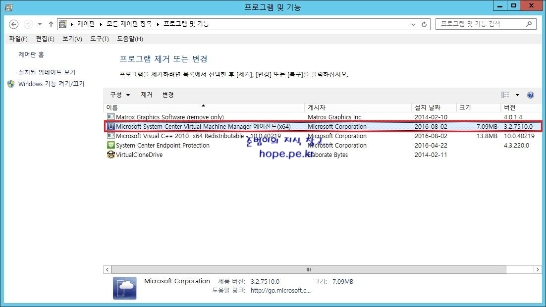 프로그램 및 기능 에서, 'Microsoft System Center Virtual Machine Manager 에이전트(x64)' 가 설치 되었음을 확인 할 수 있습니다.