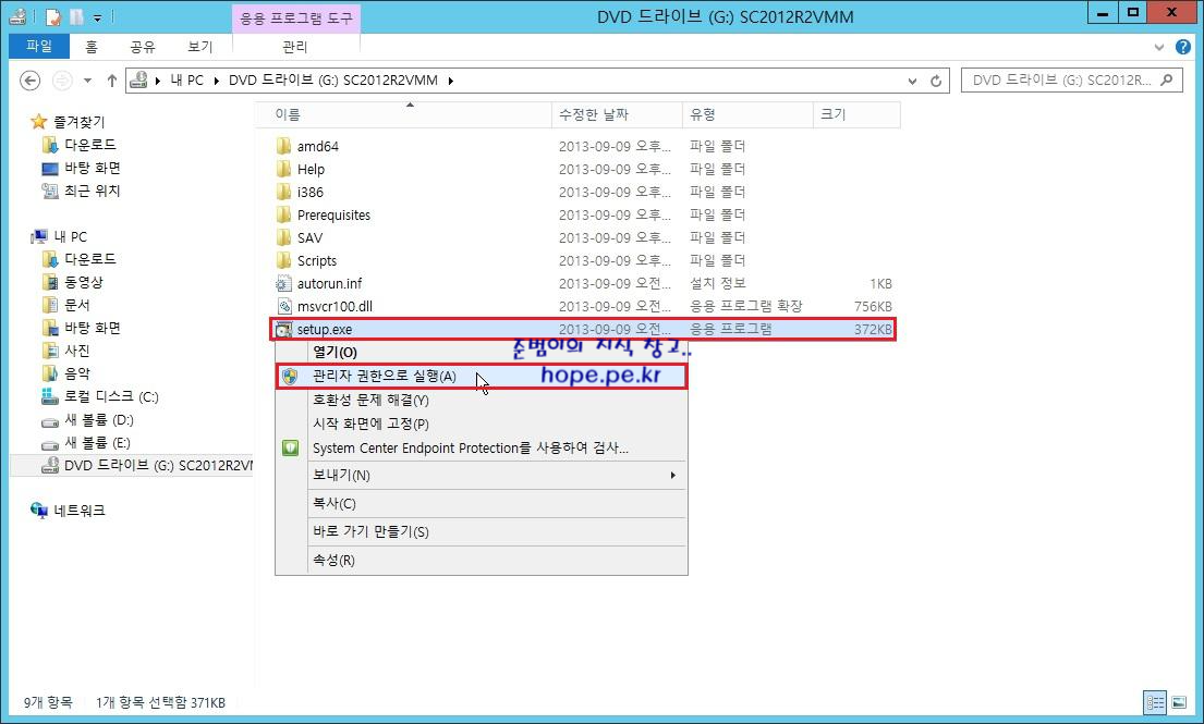 System Center 2012 R2 Virtual Machine Manager 설치 미디어를 DVD 드라이브에 삽입 후 '해당 드라이브 - setup.exe 파일' 에서 우클릭 후 "관리자 권한으로 실행'' 을 클릭 합니다.