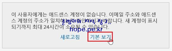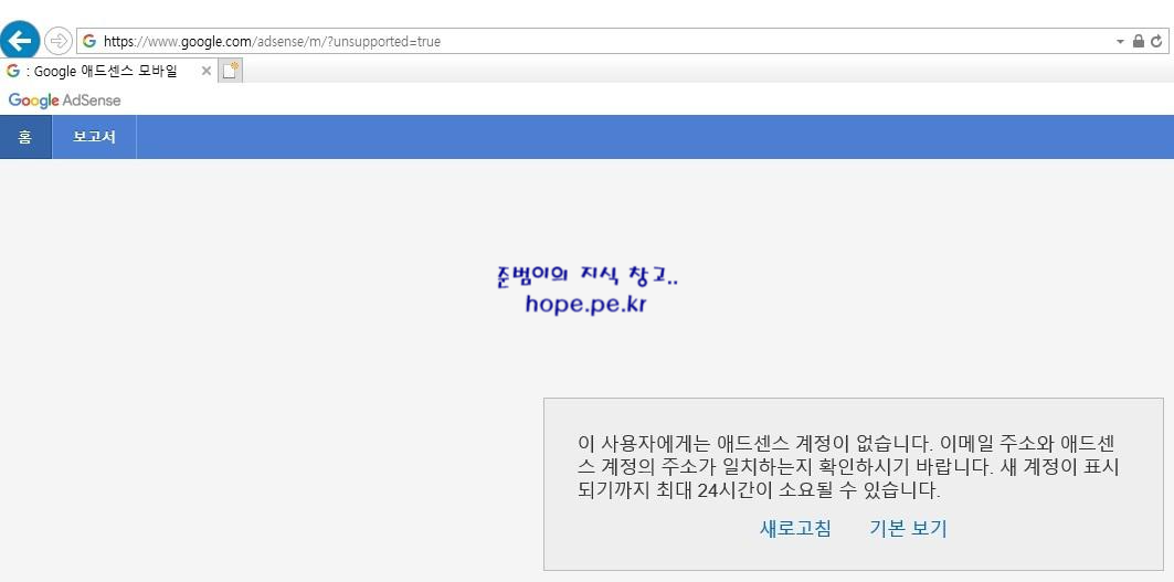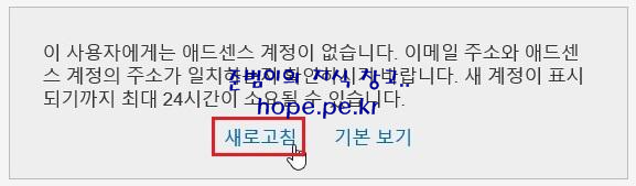 Google AdSense 홈 페이지 화면에서, '이 사용자에게는 애드센스 계정이 없습니다. 이메일 주소와 애드센스 계정의 주소가 일치하는지 확인하시기 바랍니다. 새 계정이 표시되기까지 최대 24시간이 소요될 수 있습니다.' 메세지가 표시 됩니다.