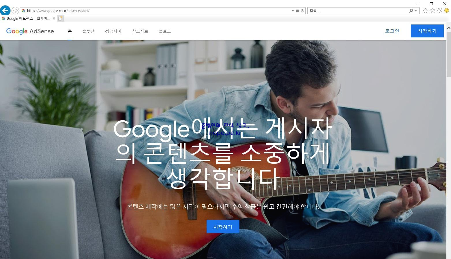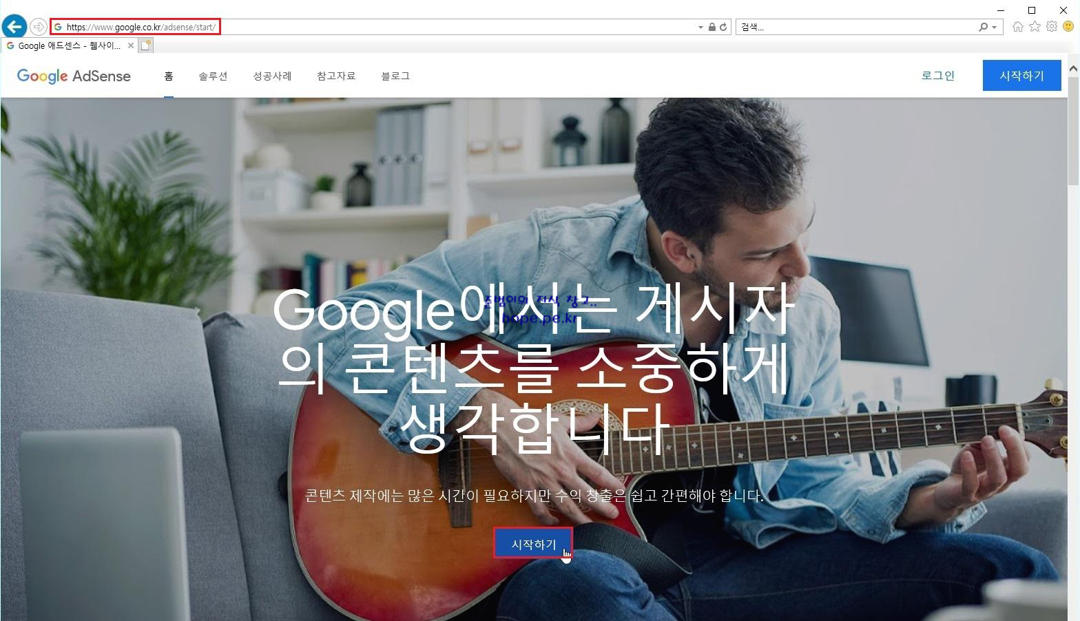 Internet Explorer 에서 구글 애드센스 (https://www.google.co.kr/adsense/start) 사이트에 접속 후 '시작하기' 를 클릭 합니다.
