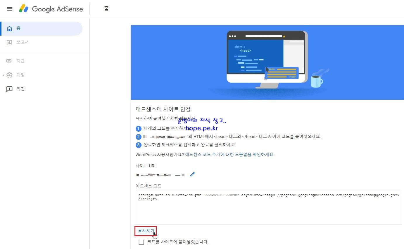 애드센스에 사이트 연결 화면에서, '복사하기' 를 클릭 합니다.