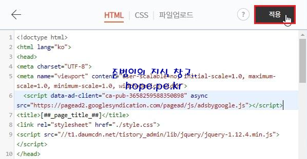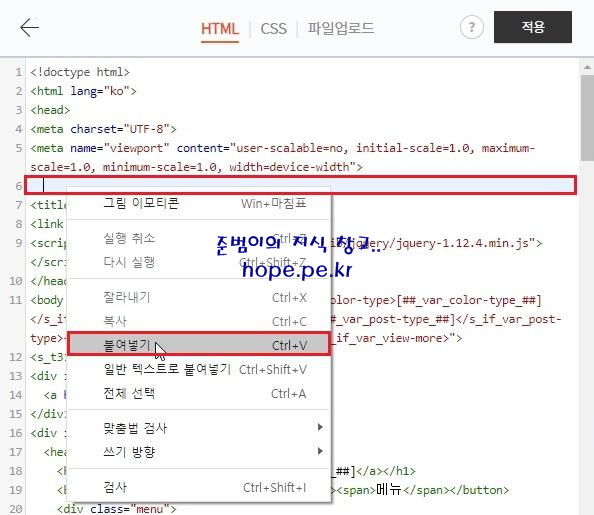 HTML 화면에서, <head> 와 </head> 태크 사이에 복사한 코드를 '붙여넣기' 합니다.