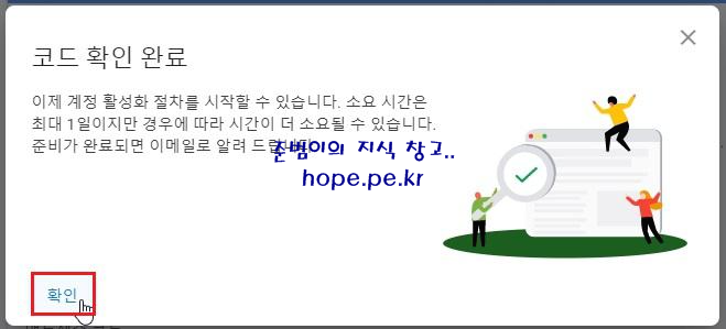 코드 확인 완료 창에서, '확인' 을 클릭 합니다.