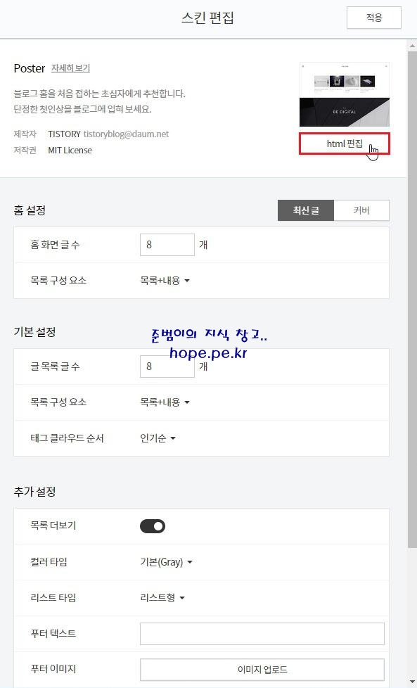 스킨 편집 화면에서, 'html 편집' 을 클릭 합니다.