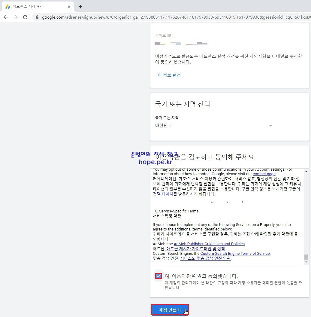 '예, 이용약관의 내용을 읽었으며 동의했습니다.' 에 체크 후 '계정 만들기' 를 클릭 합니다.