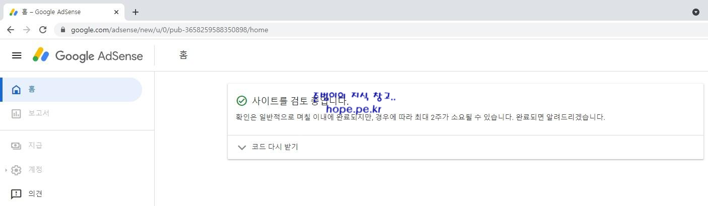 사이트를 검토 중입니다. 화면이 발생하면 구글 애드센스 신청이 완료 되었습니다.